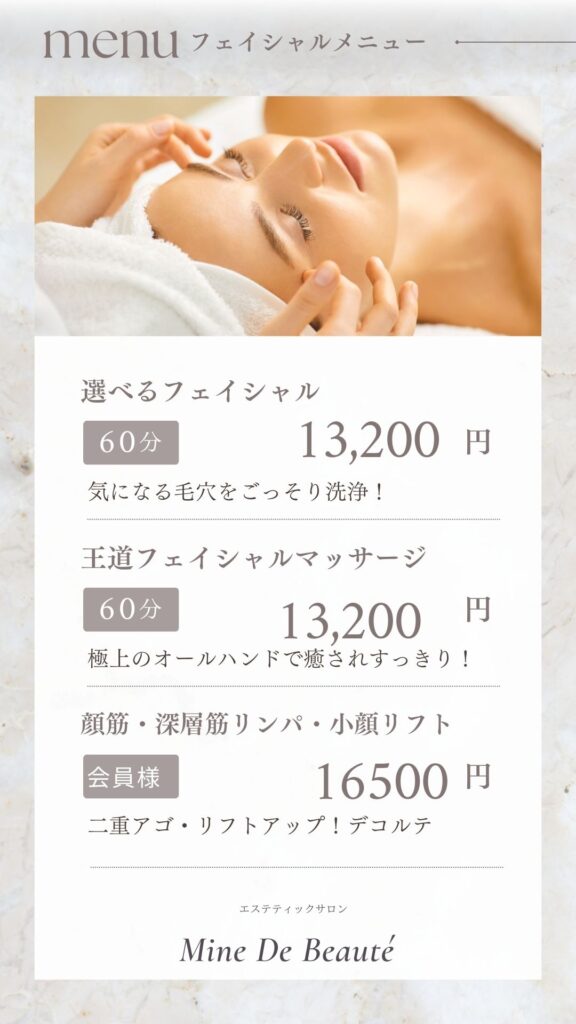 ◎オーダーメイド施術: 小顔、リフトアップ、デコルテケアなど、多岐にわたるメニューを組み合わせ、あなたに合った施術をカスタマイズします。