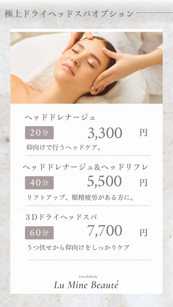 筋膜調整にオプションでつけられるヘッドドレナージュ20分〜筋膜ケアを入れた3Dヘッドケア60分まで、ご用意しております。